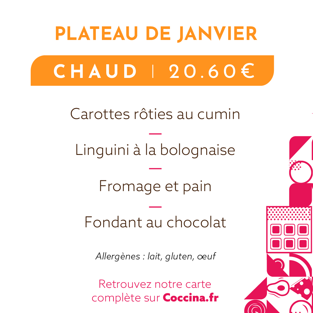 De plus, vous avez la possibilité d’opter pour l’option « plat chaud » sur les plateaux à 16,40€ et 18,60€, remplaçant ainsi le plat principal froid, moyennant un supplément de 2€ hors taxe par plateau.